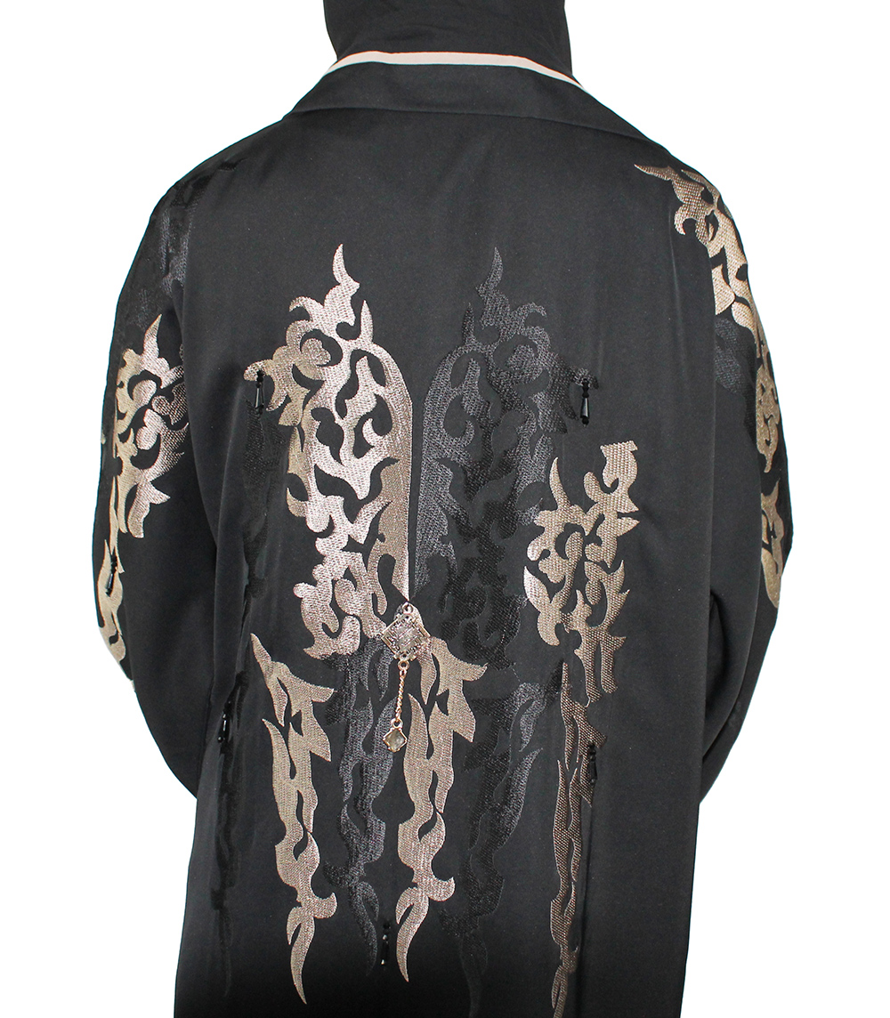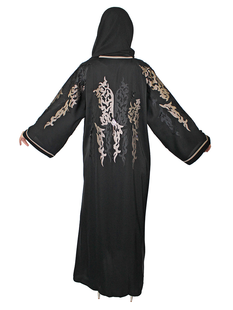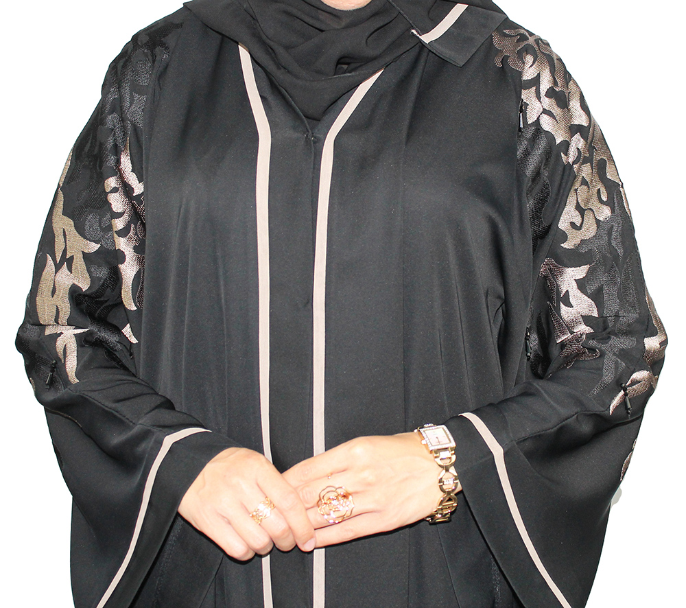 Abaya noire accompagnée d’une splendide broderie en gold et noire, avec fermeture boutons pression.