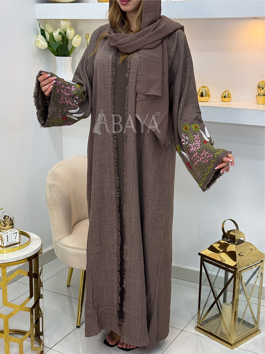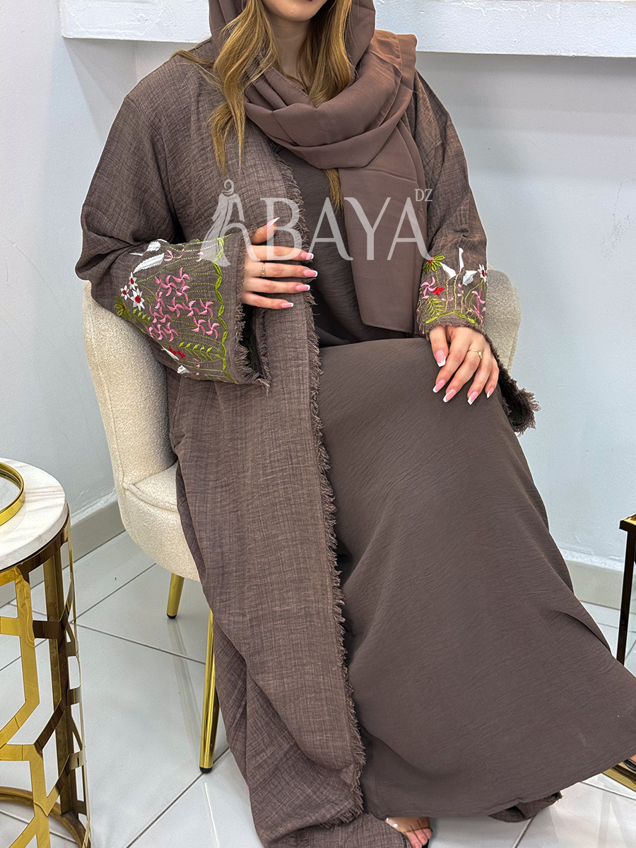Abaya Kimono 2 Pièces Marron avec Broderies Florales