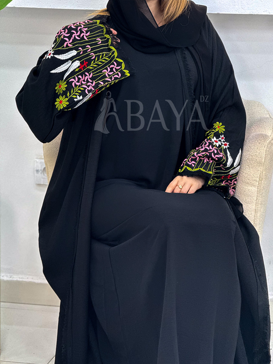 Abaya Kimono 2 Pièces Noire avec Broderies Florales